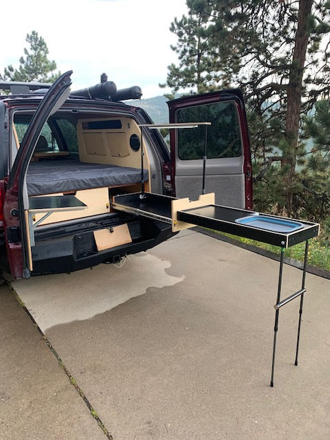 This time we turned a 1999 GMC Suburban into a Camper! This customer wanted a bed that slept two people. He also wanted the bed to convert into lounge seating and have pullout drawers underneath. We kept the larger back seat behind the drivers seat that seats two people and added a fridge cabinet next to it.